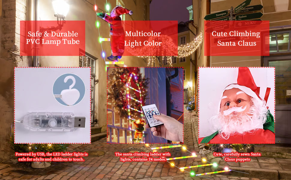 Enhance your Christmas spirit with our Santa ladder. It consists of luminous rope ladders and detachable Santas that are the perfect complement to your home's walls, gardens, terraces, Windows, porches and Christmas tree decorations. Add a touch of magic to your Christmas celebrations!