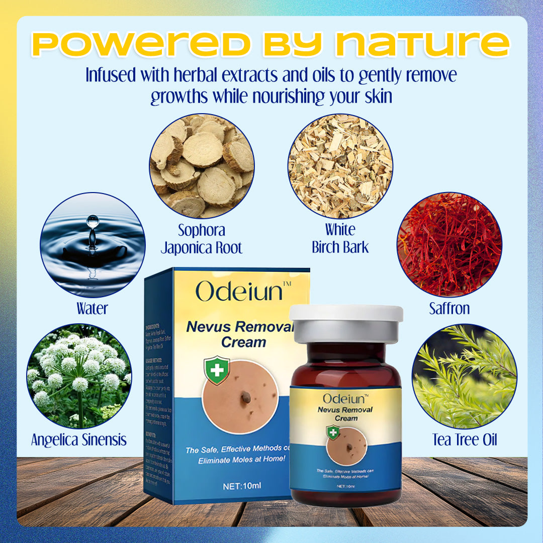 ODEIUN™ Nevus Removal Cream is the perfect solution for anyone seeking clear, flawless skin without resorting to invasive treatments. Unlike lasers or surgical options, this cream provides a safe, gentle, and painless alternative by addressing skin blemishes from within. The carefully selected natural ingredients work to penetrate deep into the skin, targeting the root of moles, nevi, and dark spots while soothing and rejuvenating the surface. With antioxidant-rich botanicals like Saffron and Tea Tree Oil, the cream not only removes imperfections but also nourishes the skin, reduces inflammation, and prevents future discoloration. This multi-action formula makes ODEIUN™ a trusted, effective choice for achieving radiant, blemish-free skin.